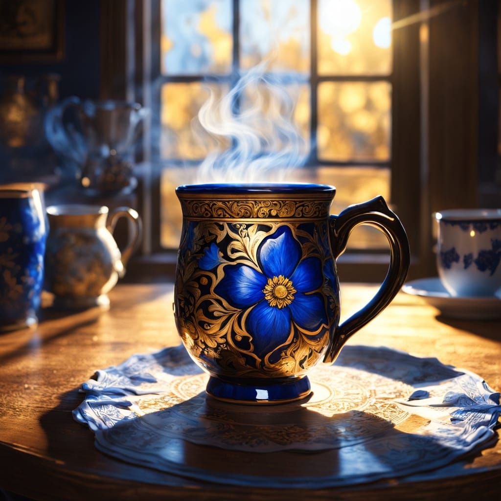 This photorealistic still life captures an ornate ceramic mug with cobalt blue floral patterns and gold accents, filled with steaming coffee. Warm morning sun streams through an antique window, creating a golden hour atmosphere.