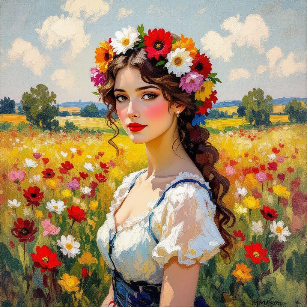 This image showcases a vibrant oil painting of a woman adorned with flowers for hair, set against a lush floral field. It features rich impasto textures and warm, saturated colors with soft lighting, creating a romantic and ethereal feel.