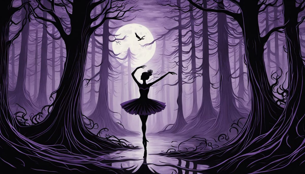 A dark fantasy illustration of a ballerina dancing in a pine forest under a somber moonlight. Twisted roots and muted purple mist add to the cosmic horror aesthetic.