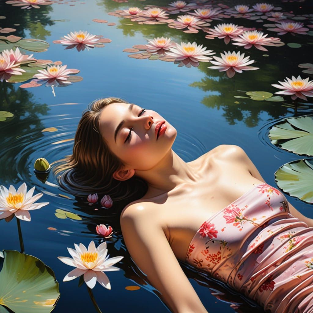 This image depicts a beautiful woman lying down amidst vibrant water lilies and delicate Japanese cherry blossoms, bathed in warm, golden light, evoking a serene atmosphere reminiscent of Impressionist art.