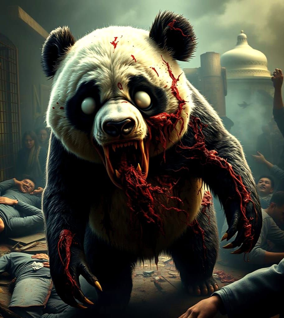 This haunting image shows a zombie panda bursting from a dark cage, with torn fur and gruesome wounds, amidst a scene of chaos and terror as people flee in horror