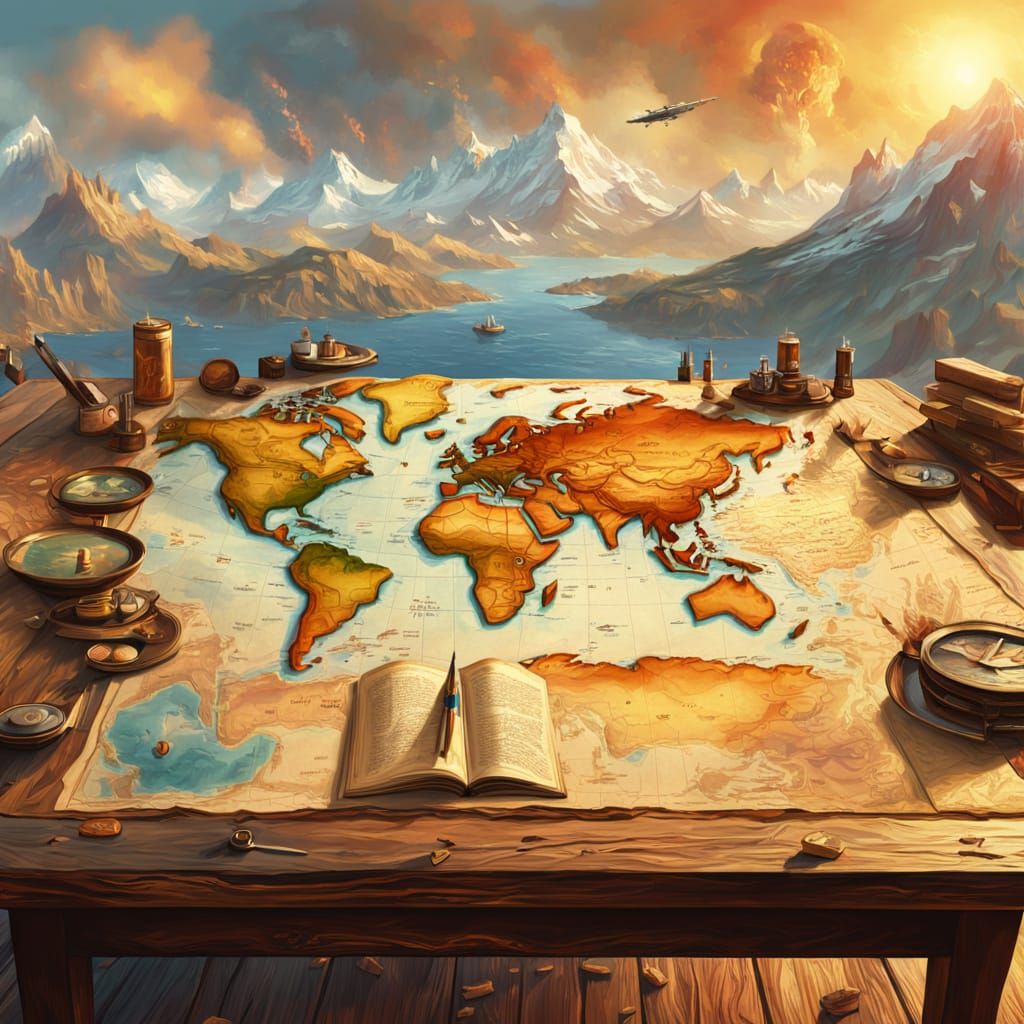 This image shows a world map depicted as a vibrant oil painting. The map is rendered with soft brushstrokes, warm golden light, and muted colors, creating a hyper-realistic and detailed science fiction illustration.