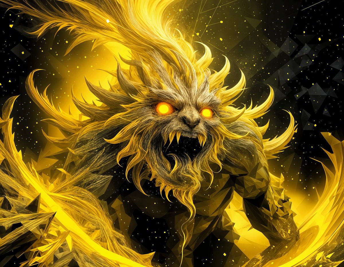 This image shows a colossal ancient monster emerging from swirling cosmic dust, rendered in abstract vector fractal art with soft, bright yellow lighting.
