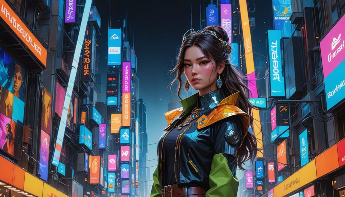 This image shows a hyperrealistic portrait of a young woman. She is adorned with colorful clothing and futuristic jewelry, rendered with dynamic lighting and volumetric shadows in the style of digital art.