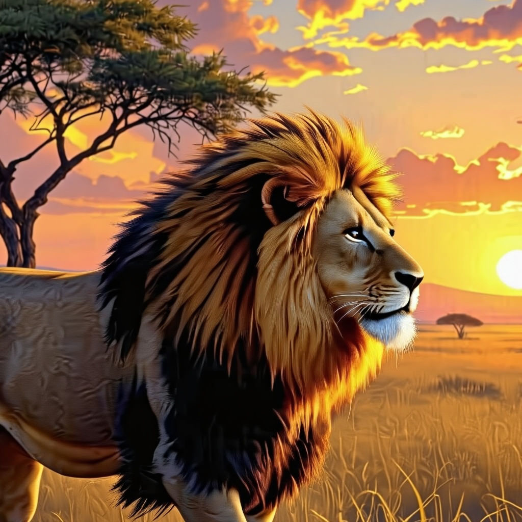 A majestic lion, king of the savanna, pauses mid-stride, its mane catching the golden light of a setting sun. Acacia trees dot the distant h...
