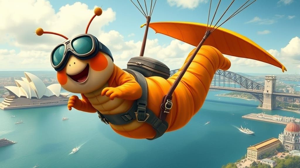 A vibrant image of a caterpillar paragliding over Sydney Harbour. The caterpillar wears an orange jumpsuit and goggles, set against the Opera House and Harbour Bridge, in whimsical style.