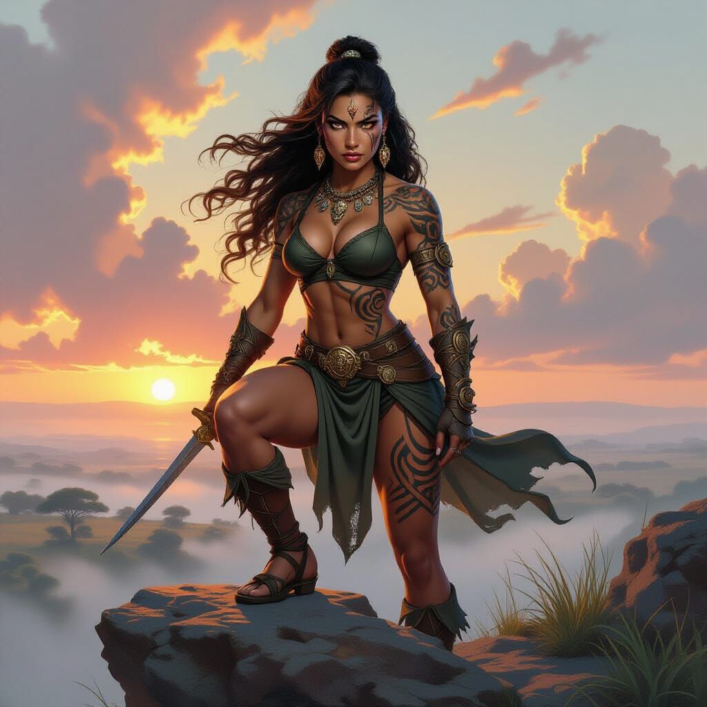 A striking picture of a muscular lioness warrior woman overlooking a misty savanna at dawn. The image is reminiscent of heroic fantasy art, with bold brushstrokes and dynamic lighting.