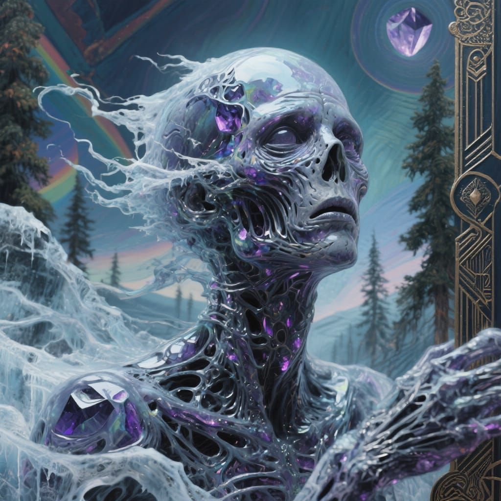 This image shows a frozen entity expressing devotion in an otherworldly scene. The work has a chemical, alien aesthetic with embossed textures, inspired by surrealist and symbolist art.