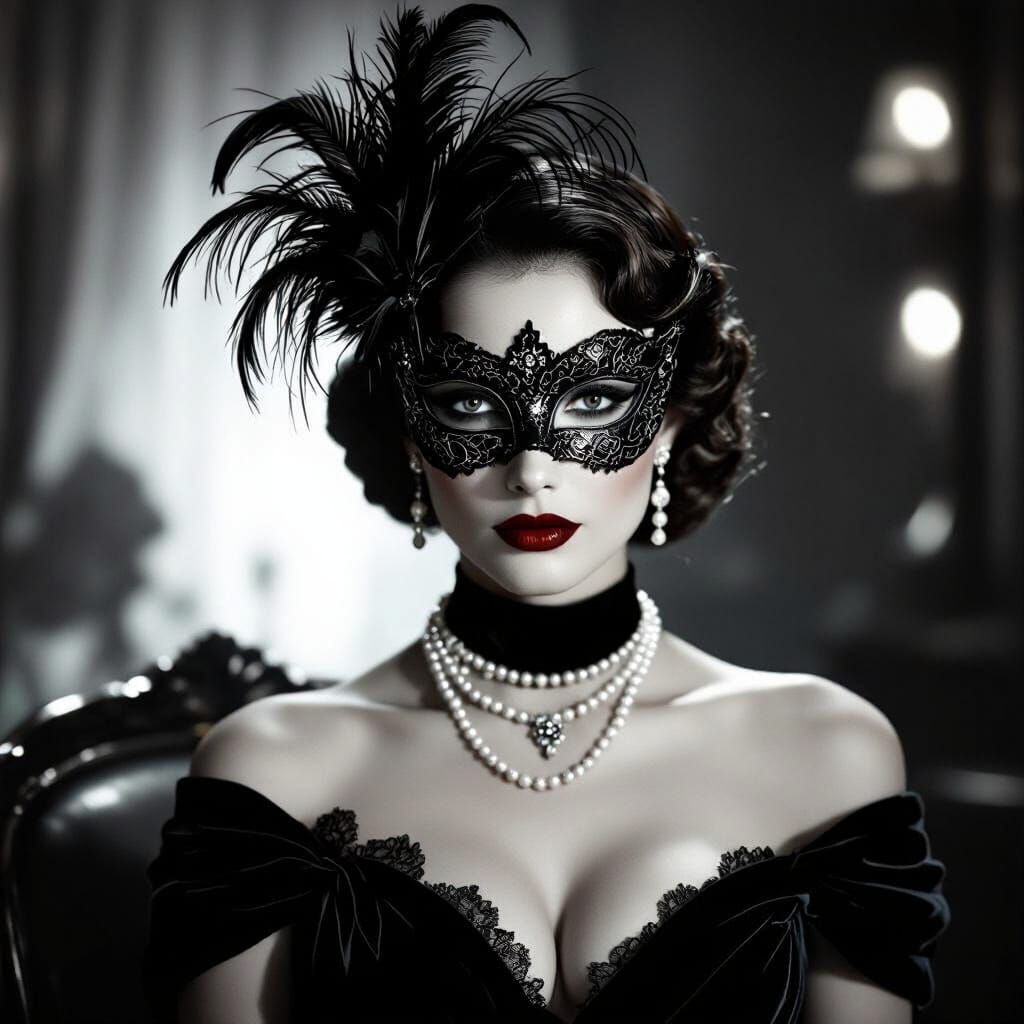 A captivating image of a woman in a dark velvet gown, face concealed by a feathered mask, set in a dimly lit Parisian salon. The scene evokes the Film Noir era with dramatic shadows.