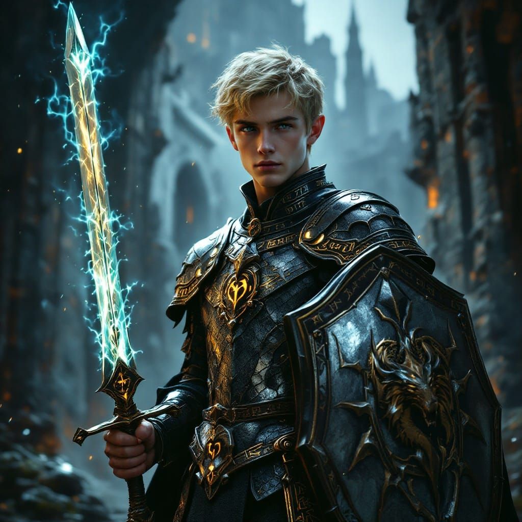 This image shows a heroic young man in intricately crafted draconic plate mail armor, standing proudly in front of a Gothic castle with a mystical aura. He wields a sword and shield, surrounded by dynamic lighting and a rich, contrasting color palette.