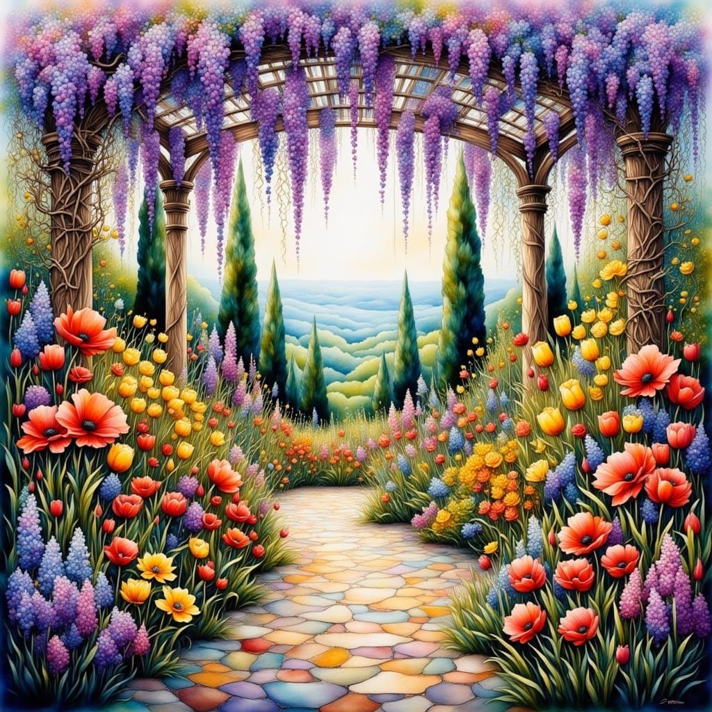 A vibrant watercolor painting depicts a flower garden featuring wisteria, poppies, tulips and roses beneath a pergola. The abstract artwork uses bold brushstrokes and vivid colors.
