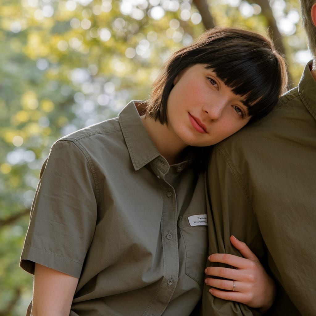 A touching image of a young woman with dark hair leaning on someone's shoulder. Soft, warm light filters through the trees, highlighting the intimacy of the moment, captured with a candid photography aesthetic.