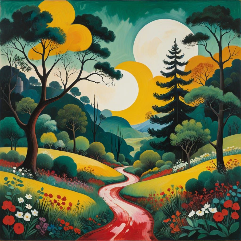 This image features stylized pine trees against surreal, liquid-like rock formations in vibrant colors. A serpentine path leads to a lush oasis, evoking a mystical atmosphere with bold, organic forms.