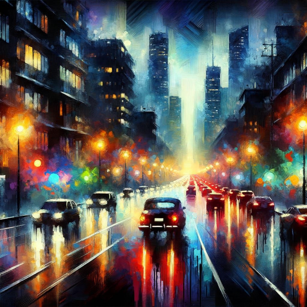 rainy night, city street, reflections of lights on the road, cars driving in the distance, an oil painting with heavy brush strokes, atmospheric perspective, dark and moody, muted colors.