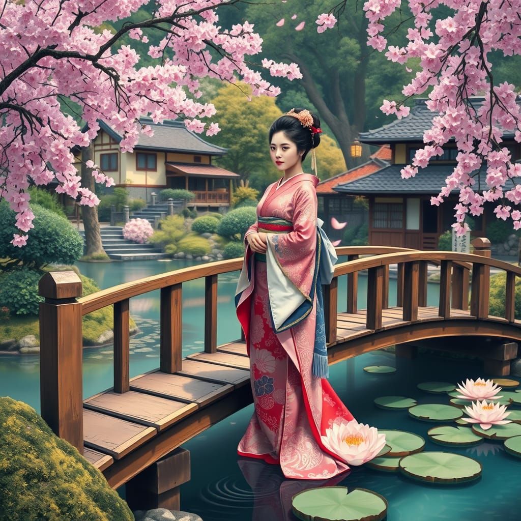 This image shows a beautiful geisha woman standing on a wooden bridge surrounded by lush greenery, delicate cherry blossoms, and traditional Japanese homes. The serene atmosphere is captured in warm, diffused light with soft colors reminiscent of Impressionist art.
