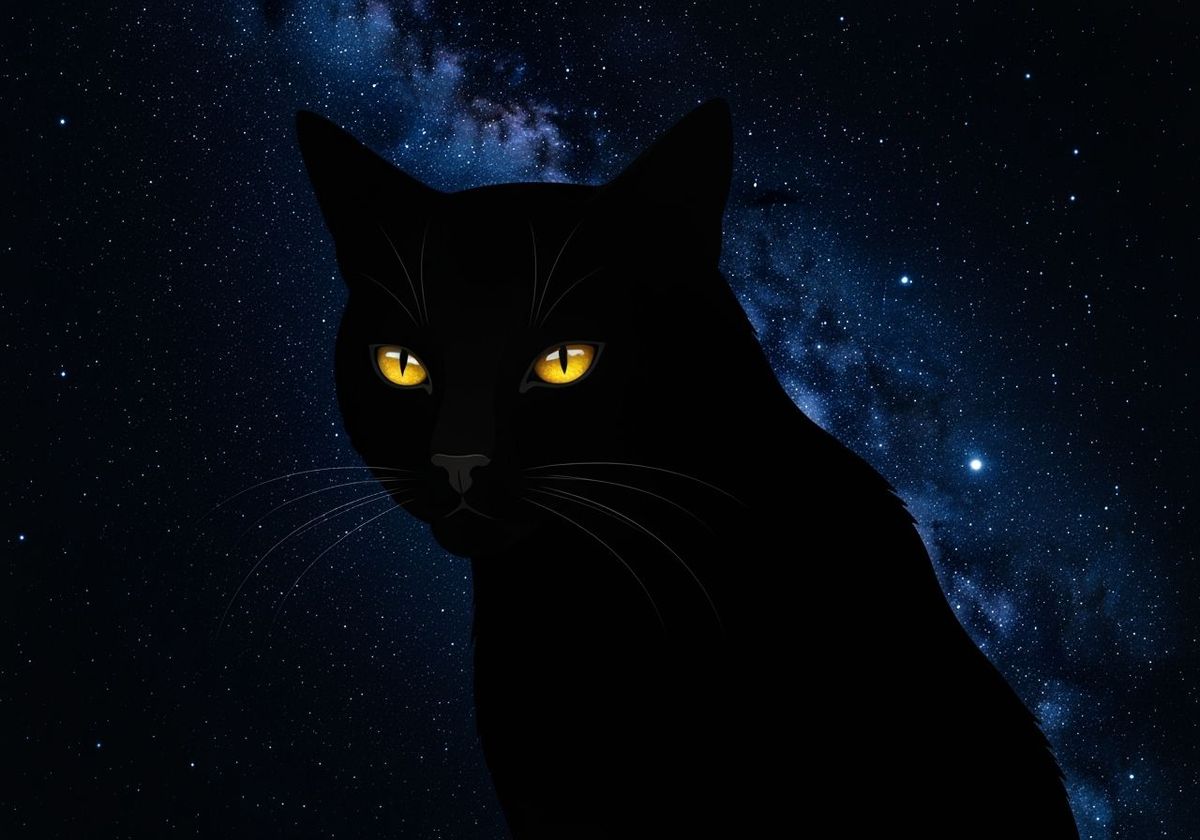 This image shows a sleek black cat with piercing golden eyes, its form merging seamlessly with the deep, star-filled darkness of the night sky.