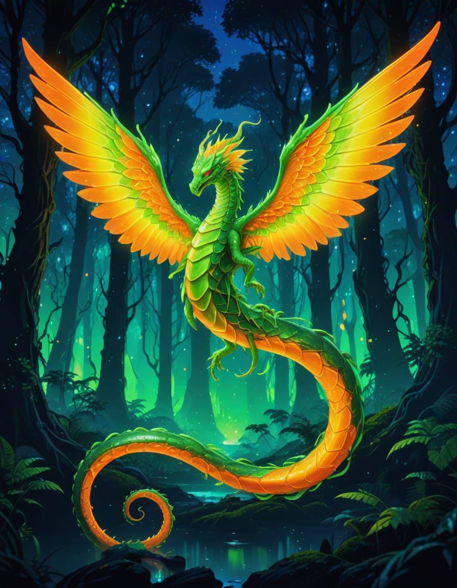 A vibrant anime-style illustration of a divine serpent-human hybrid in a bioluminescent forest. The figure features glowing scales, wings, and a glossy, neon-colored texture.