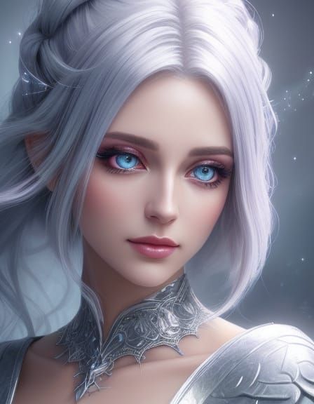 This image shows a close-up portrait of a woman with silver hair and radiant, shimmering eyes. The fantasy art style features a glowing aura, voltage sparks, and soft, ethereal lighting in pastel colors.