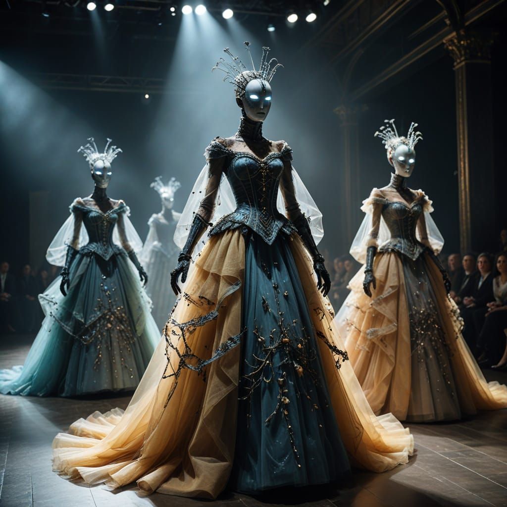 This image captures the drama of futuristic fashion models walking the catwalk in extravagant, layered gowns, set against the backdrop of a Paris fashion show under vibrant spotlights, with a cinematic film aesthetic and atmospheric lighting.