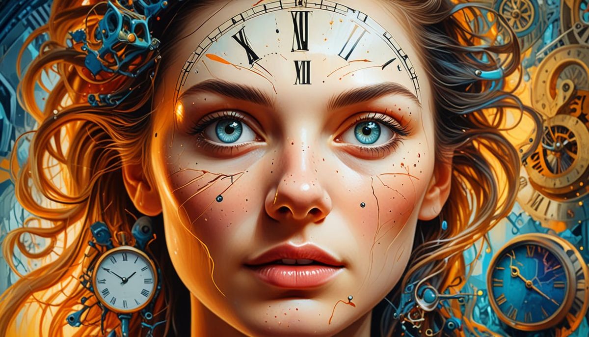 A surreal portrait of a woman's face that embodies the passage of time. Melting clocks adorn the background, and neuron activity illustrates psychological processes in this vibrant modern artwork.