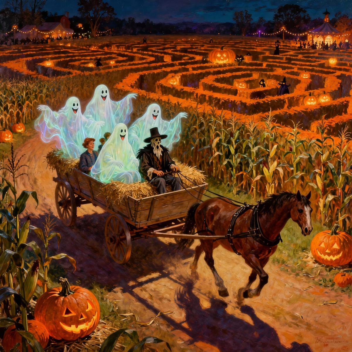This oil painting depicts happy ghosts enjoying a hayride with a headless horseman through a spooky corn maze. Warm light from jack-o'-lanterns illuminates the scene, rendered in a detailed, vibrant style.