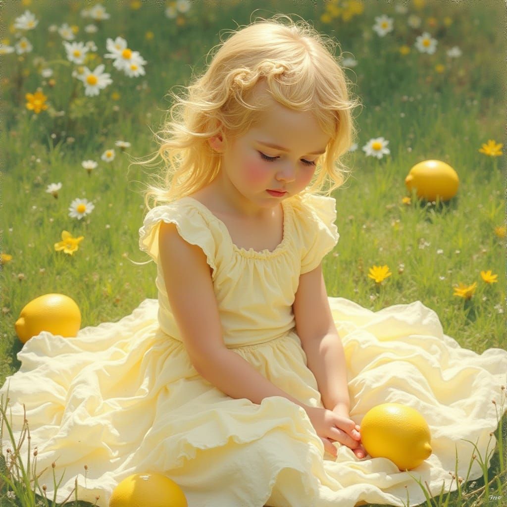 A sun-drenched image of a blonde girl in a lemon-patterned dress cautiously tasting a lemon. The scene, reminiscent of impressionist art, features soft light and a basket of lemons.