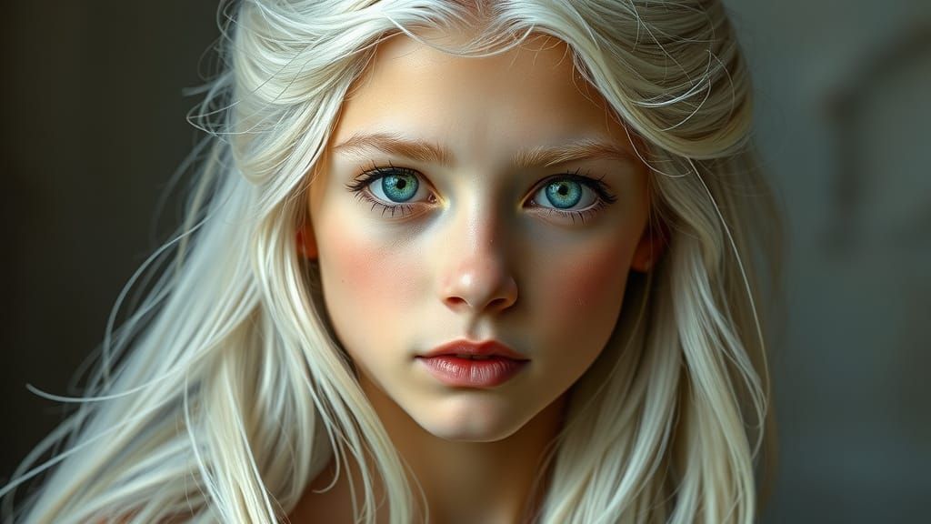 This image is a photorealistic portrait of a young woman with striking white hair and piercing green eyes, set against a soft, muted background, capturing a moment of quiet contemplation in exquisite detail.