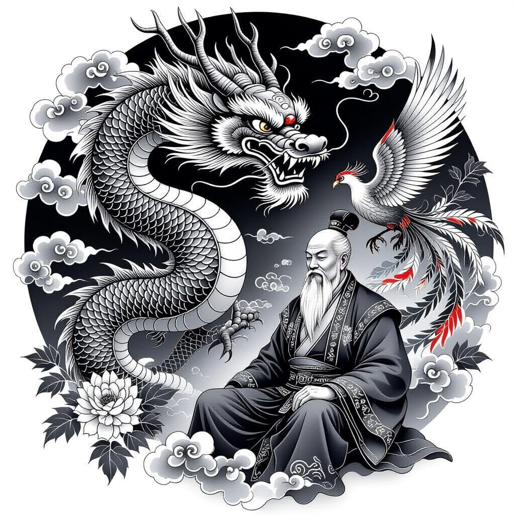 This image showcases a set of black and white tattoo designs, featuring a dragon, phoenix, man with a scroll, and tiger with turtle. The designs evoke traditional Chinese art with a modern twist.