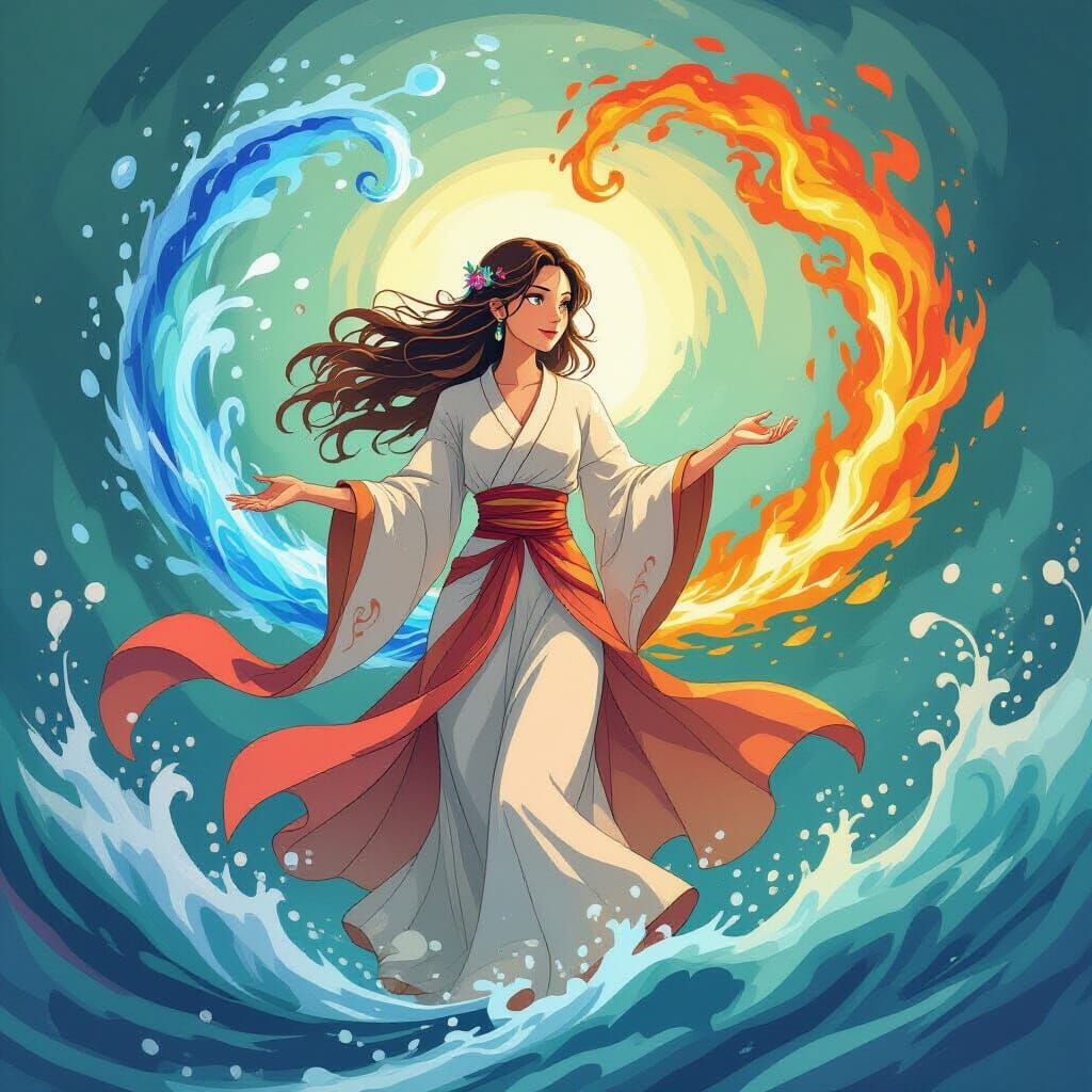 This image shows an elemental woman in flowing robes, embraced by swirling water, earth, air, and fire. The artwork has a whimsical aesthetic with vibrant colors and dynamic textures.