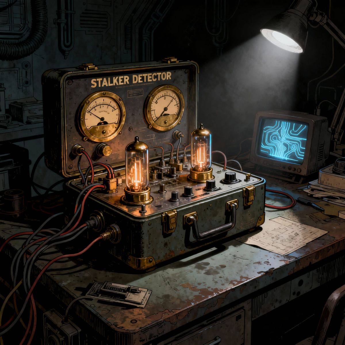 I like the steampunk style and the old tubes I recognized them as amplifier AX7 tubes and they are beautiful am loving the layout analog equipment and practical science doctor medical type sort of gauges and in travel case awesome 👍 And graphics Stalker detective stuff. I'm so ROFLMAO as well this is great meme and it should go viral on social media.