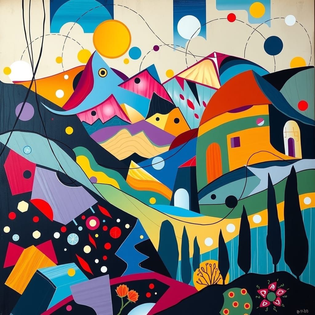 A vibrant abstract landscape painting with geometric shapes and expressionist brushstrokes. The piece is eerily lit, with a warm glow in a futuristic noir aesthetic.