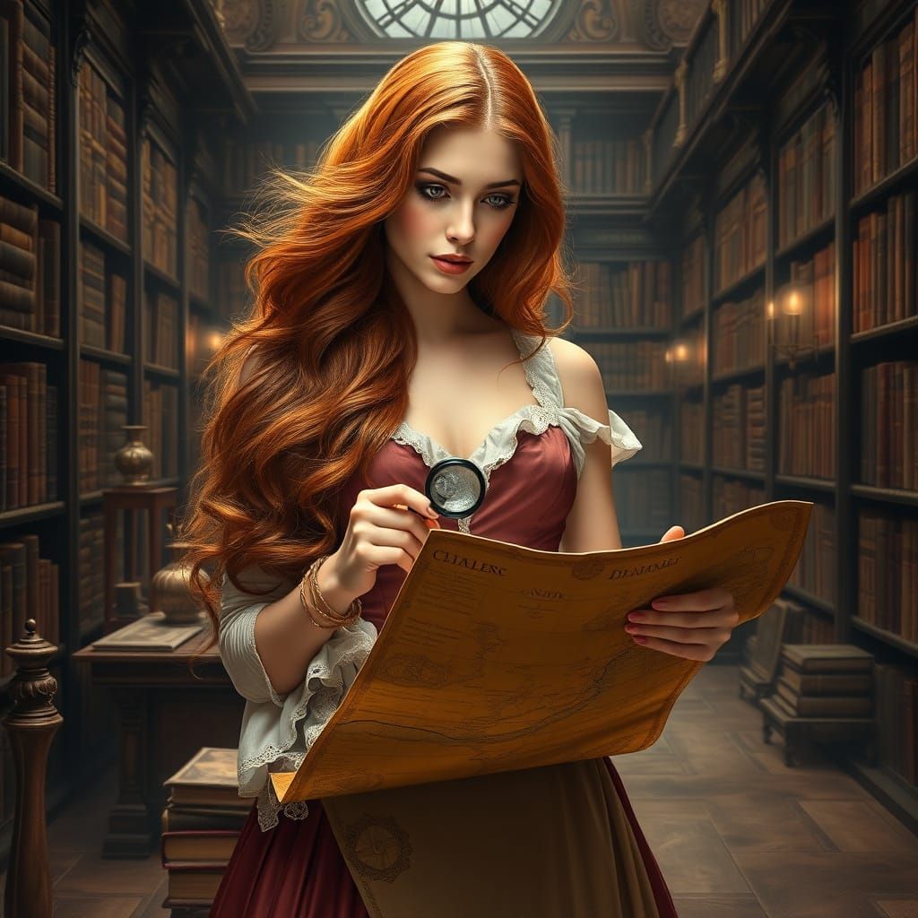 A striking picture of a woman with auburn hair in a library. She is surrounded by books and examines a map. The image displays chiaroscuro and tenebrism art styles.
