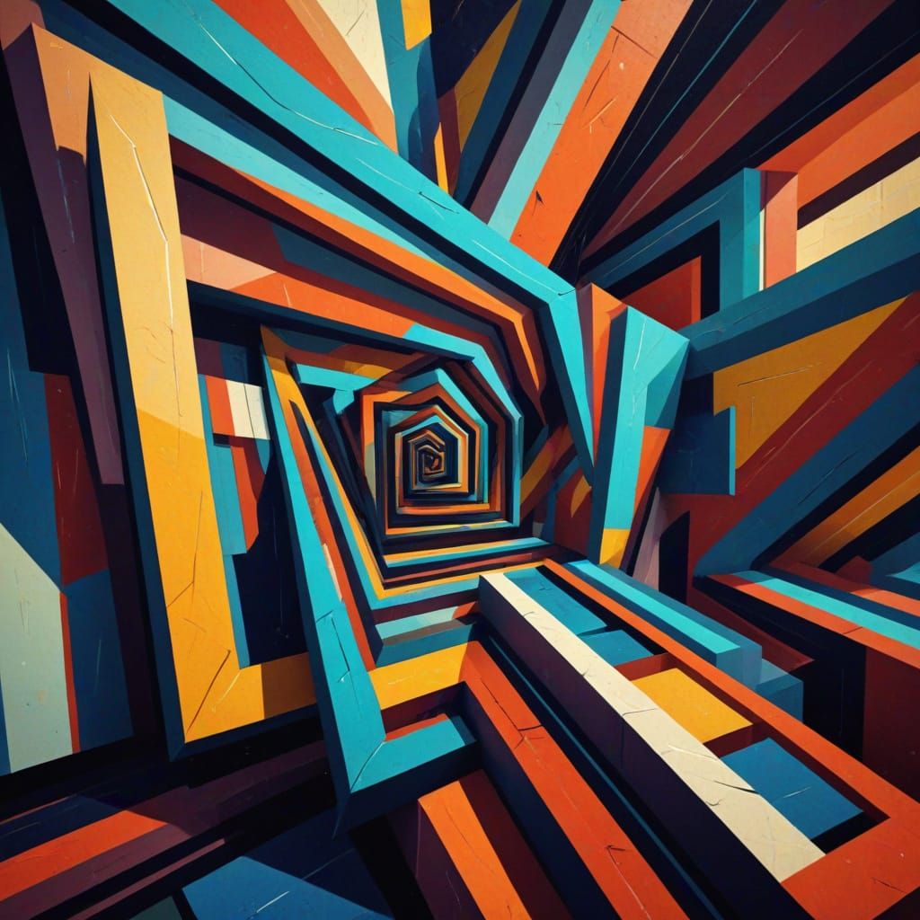 This image shows an inclined and swirling horizon in a geometric fauvism style. The vibrant colors, dynamic lighting, and high contrast create a sense of height, imbalance, and visual tension as 3D rendered digital art.