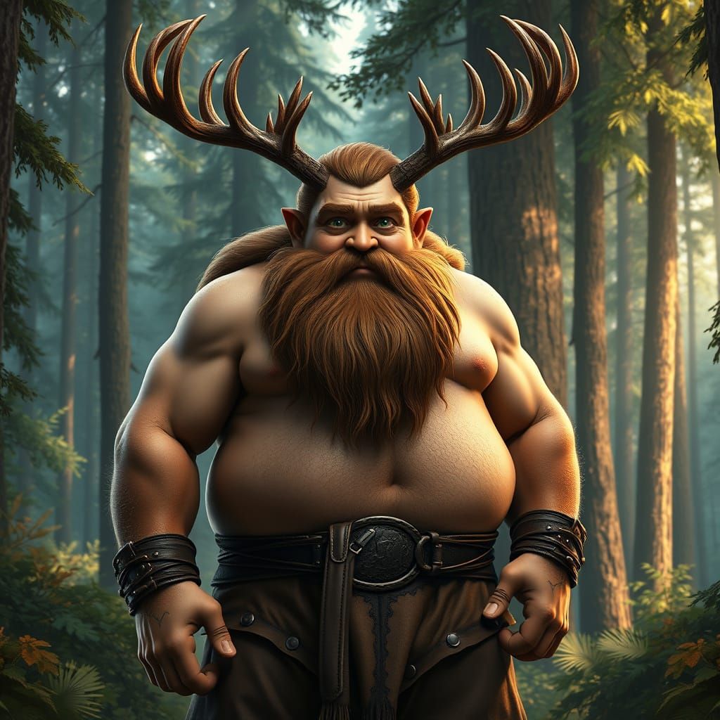 A majestic antlered god stands in a vibrant forest. The hyperrealistic image captures the god's imposing figure and the lushness of the surrounding nature with detailed textures.