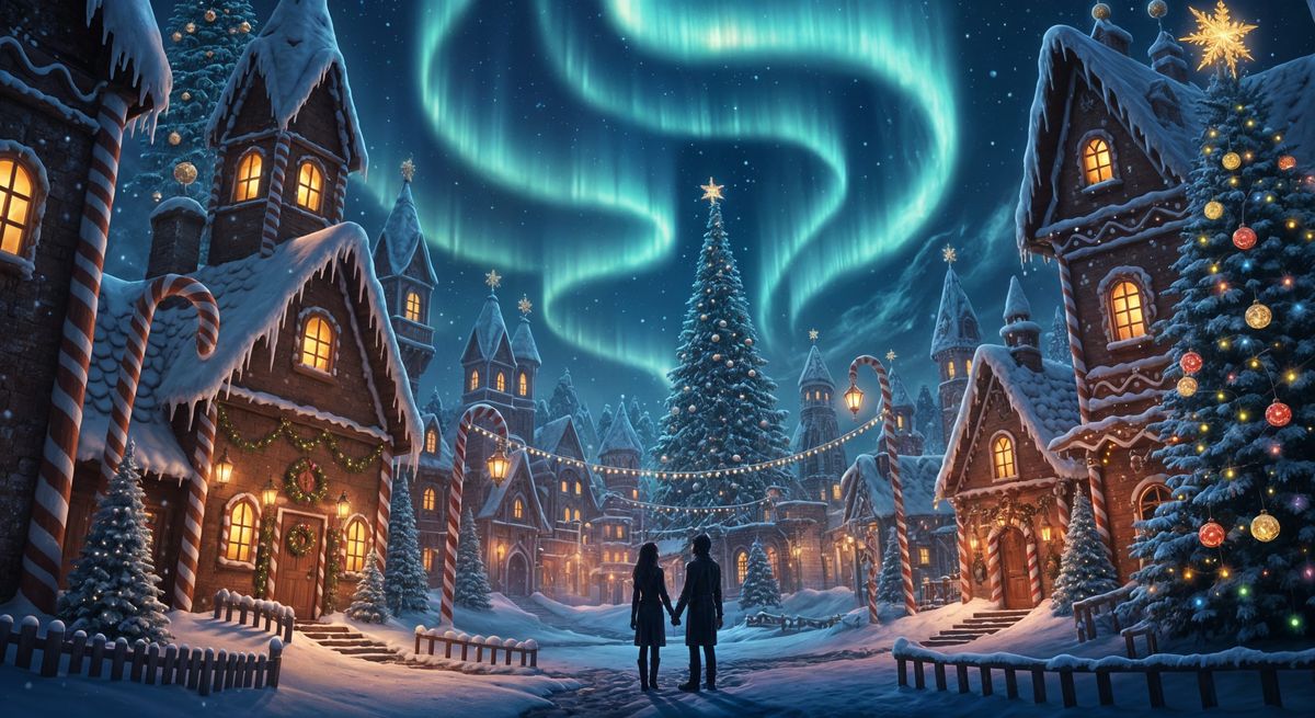 A fantastical, detailed matte painting of a romantic Christmas scene. This 8K resolution artwork features deep, complementary colors and intricate details, evoking a dreamlike fantasy concept.