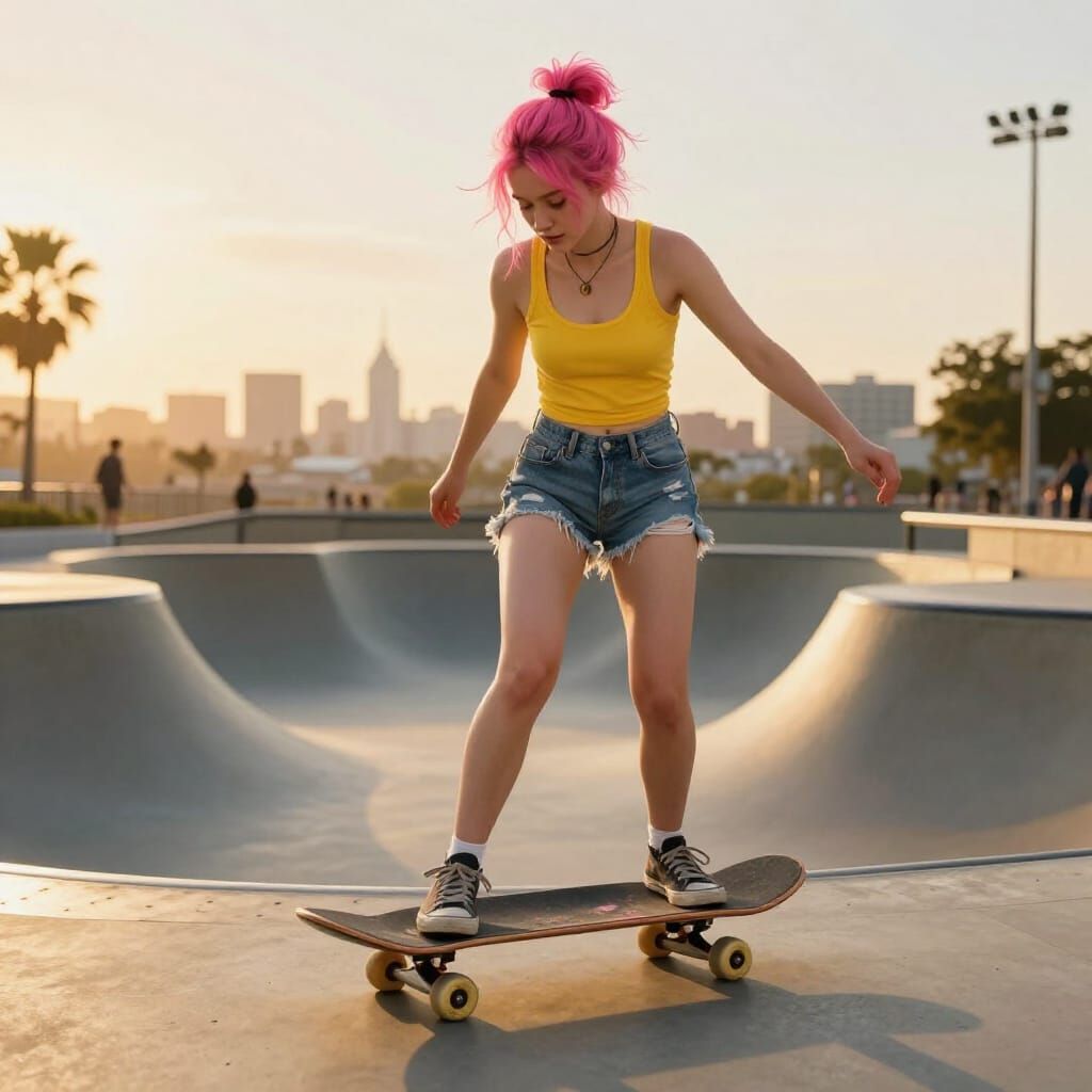 This image shows a young woman with vibrant pink hair skateboarding at a park during golden hour. Inspired by cinematic styles, it features hyper-detailed textures and a cityscape background, rendered with photorealistic matte painting and 8K resolution.