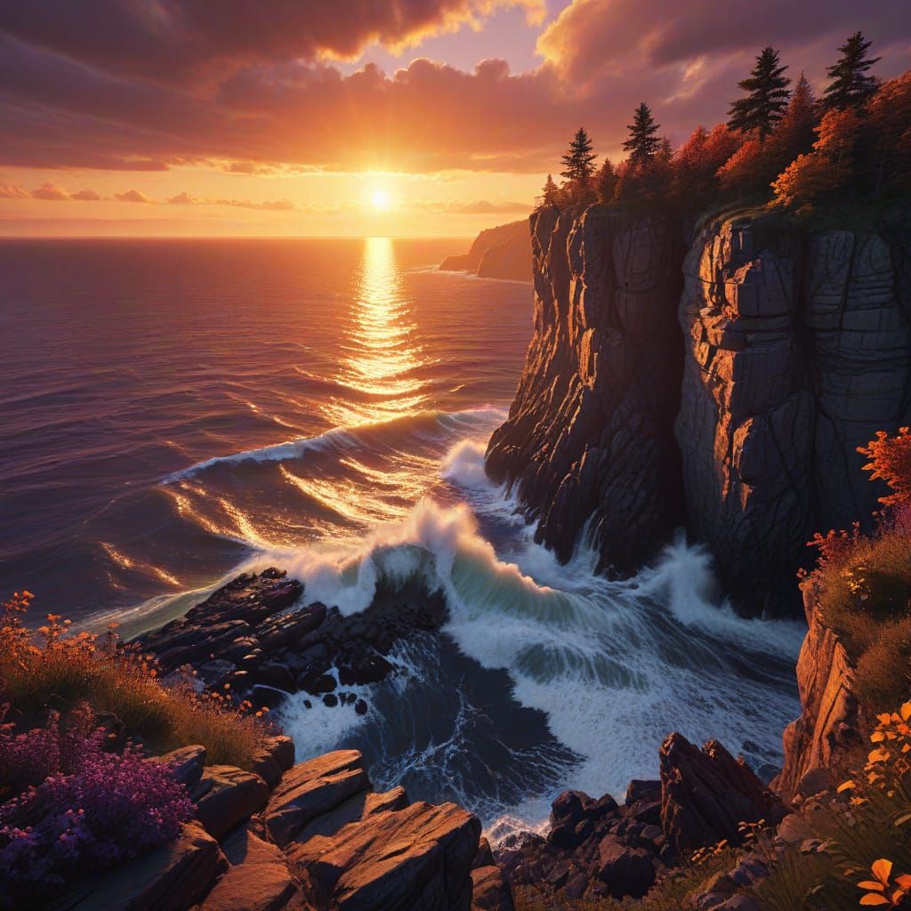 A vibrant image of a sunset over the St. Lawrence River, viewed from a cliff. Golden light reflects on the waves and a purple and orange sky create a romantic scene, as digital concept art.