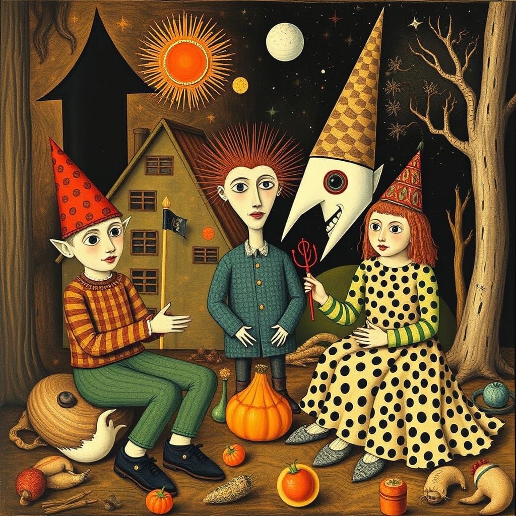This image shows a surreal, primitivist scene with magical elements. The artwork evokes a sense of wonder and naivety, reminiscent of early surrealist art.
