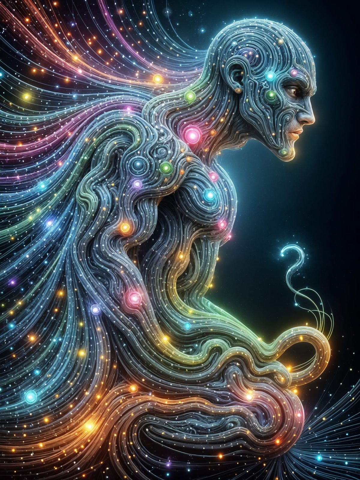 This image shows a superhero-organic hybrid, a male figure with a chiseled physique. Bioluminescent fungal growths and flowing prismatic oil cover his body, refracting light into rainbow hues in a cyberpunk aesthetic.