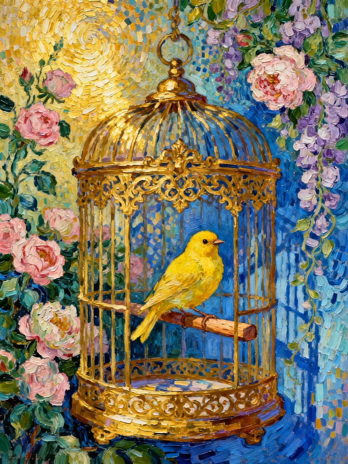 This image displays a detailed mixed media painting of an ornate golden birdcage holding a bright yellow canary. The background is rich with flowers, rendered in a thick, textured impasto style with vibrant colors.