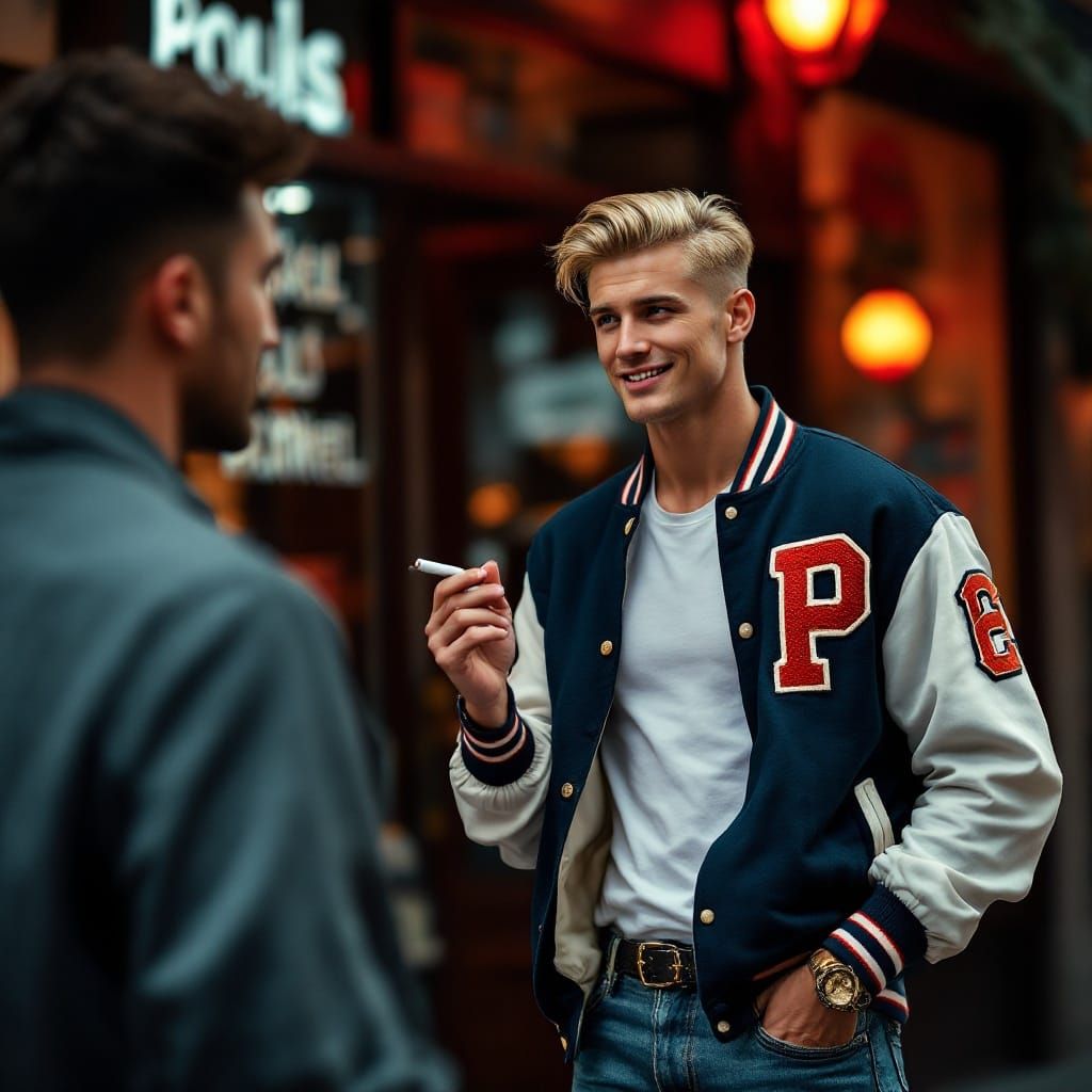 This image shows a handsome 21-year-old blond man standing outside a pool hall, flashing a charming smile. The photo, with professional lighting, captures his muscular physique in sharp focus.