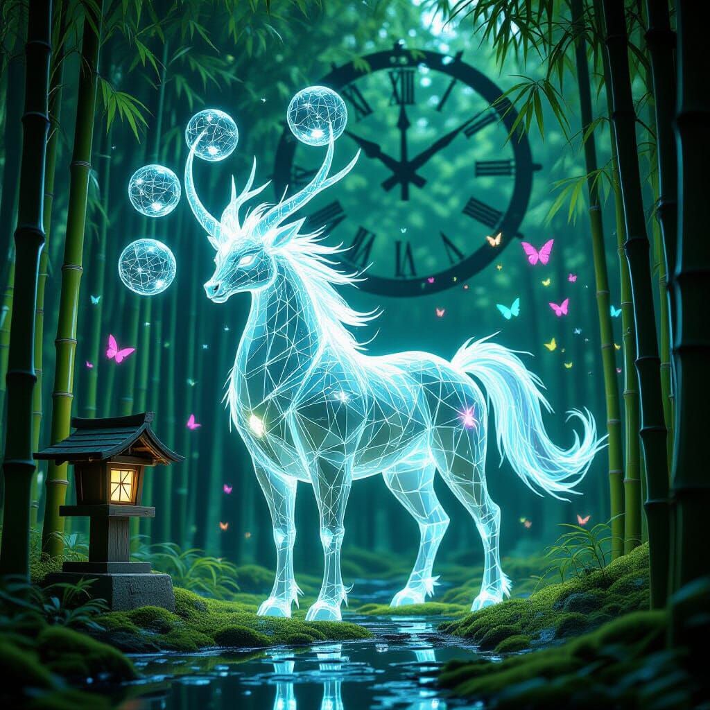 This anime-style image depicts a luminous Kirin made of energy polygons in a futuristic bamboo forest. It features orbiting mana orbs, a rustic shrine, and a curious cat-girl adventurer.