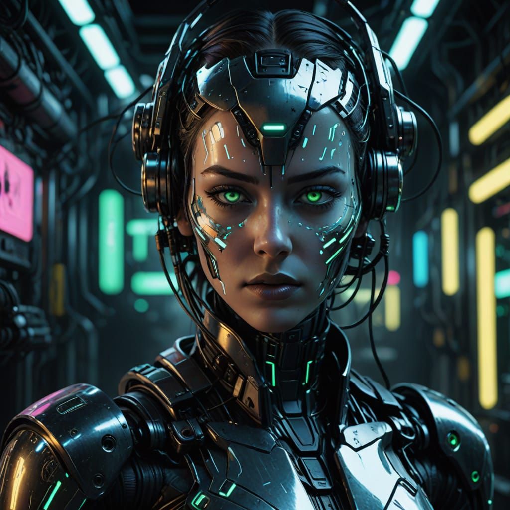 This image shows a close-up portrait of a woman with metallic face implants and a sleek black and silver exoskeleton, set against a dark industrial backdrop with moody lighting and intricate details.