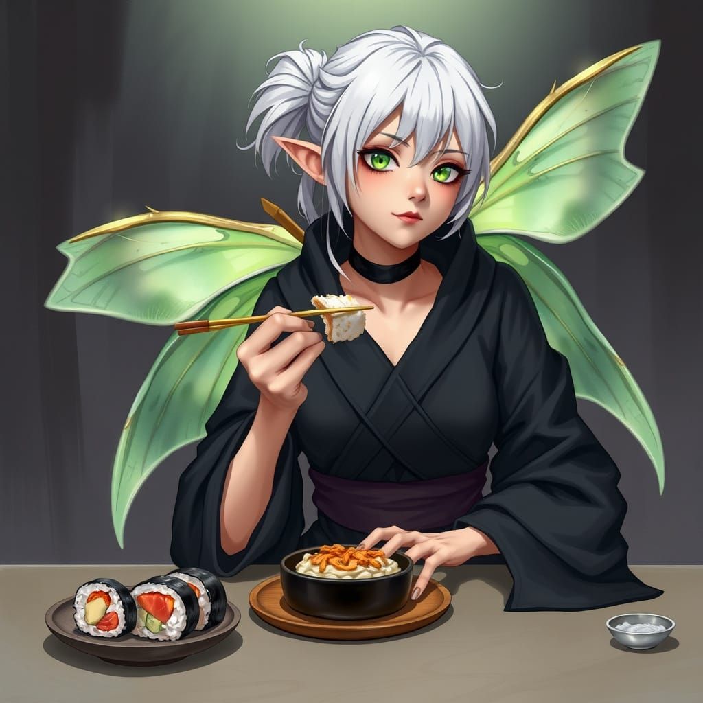 This image shows a mystical fairy in ninja attire, surrounded by hands, enjoying sushi with golden chopsticks. The fairy's light green wings and striking green eyes add to the surreal atmosphere.