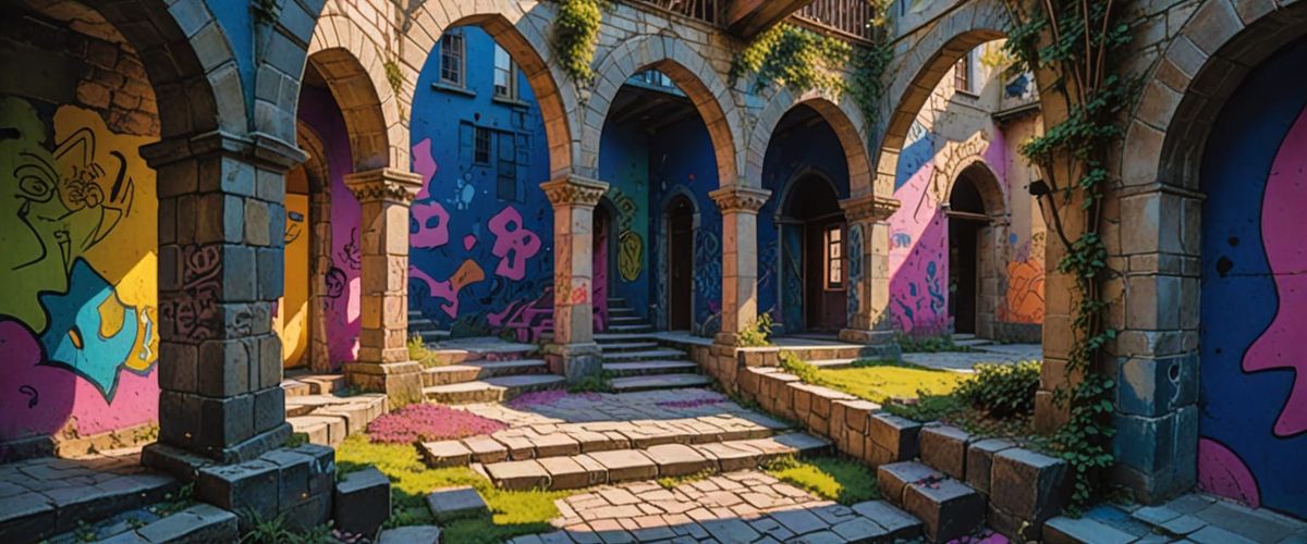 This image shows an abandoned warehouse in a slum, covered in graffiti. The composition features vibrant indigo shadows, mossy green textures, and yellow-orange light in a comic book style with watercolor effects.