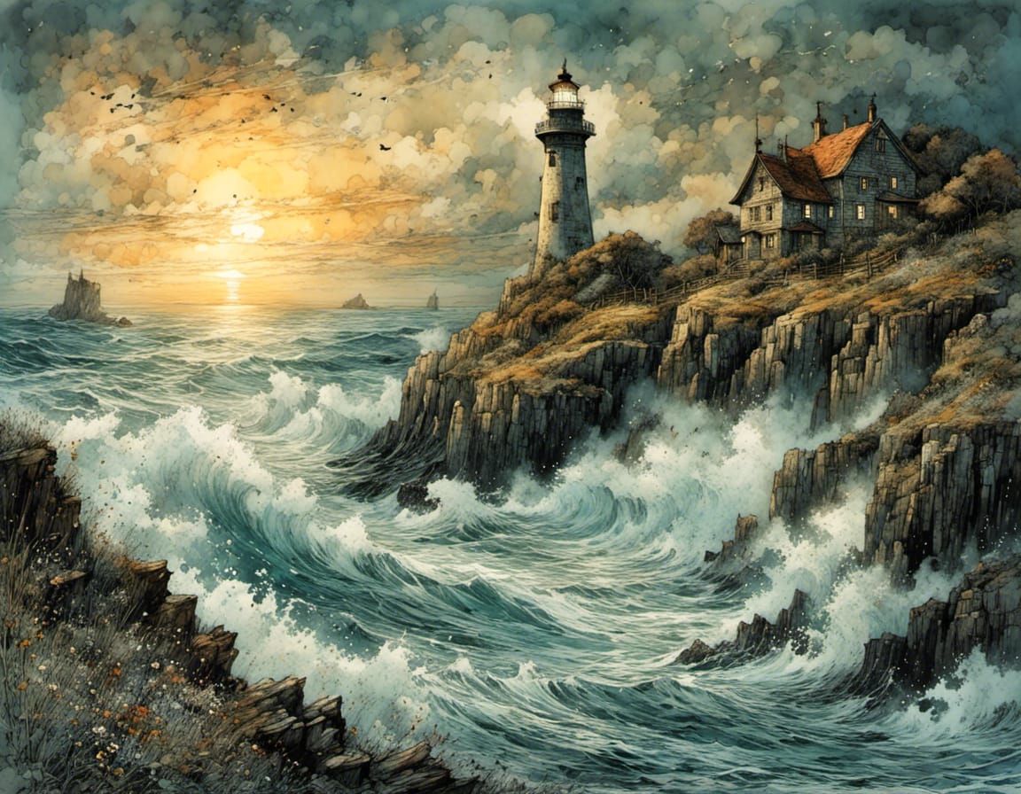 This image depicts a lighthouse perched on a rugged cliffside, surrounded by flowering plants and towering ocean waves crashing against the shore at sunset. The scene is characterized by deep, vibrant colors and an air of mystery.