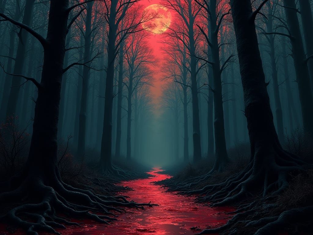 This image shows a nightmarish scene with inverted trees and a river of blood. The artwork evokes horror through deep, contrasting colors and intricate details in a Lovecraftian style.