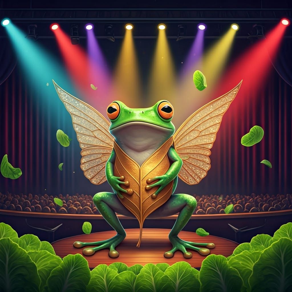 A vibrant image of a green frog in a leaf dress on a brightly lit stage. The frog has artificial wings and a shocked expression, with a cockroach emcee and lettuce-throwing audience.