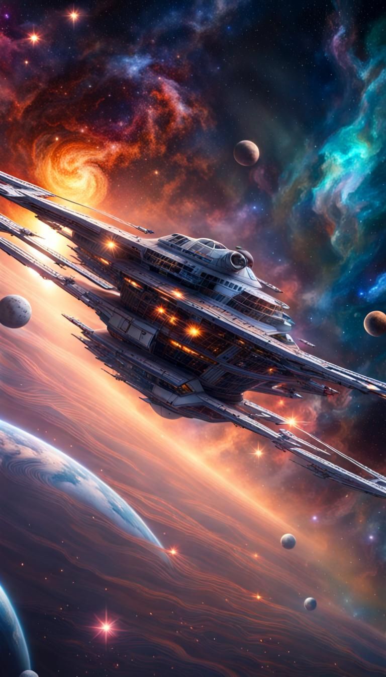 A hyperrealistic concept art image of a figure flying through a vibrant galaxy filled with stars and moons. The dramatic lighting and color depth create a stunning visual effect.