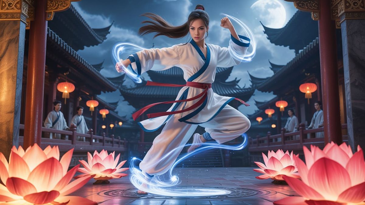 A dynamic image of a martial artist in mid-air during a kick, surrounded by glowing lanterns in an ancient courtyard. The scene is rendered with a cinematic, mystical aesthetic.